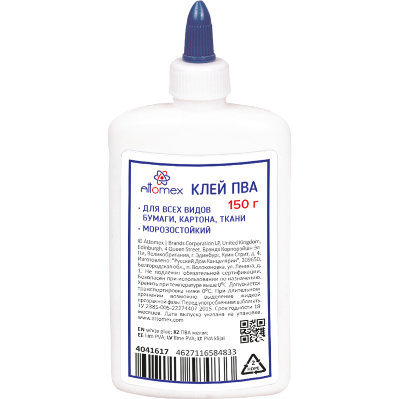 Клей ПВА "Attomex" морозоустойчивый (5 циклов) 150 г в пластиковой бутылочке с дозатором и съемным колпачком евро, дата изготовления указана на коробе